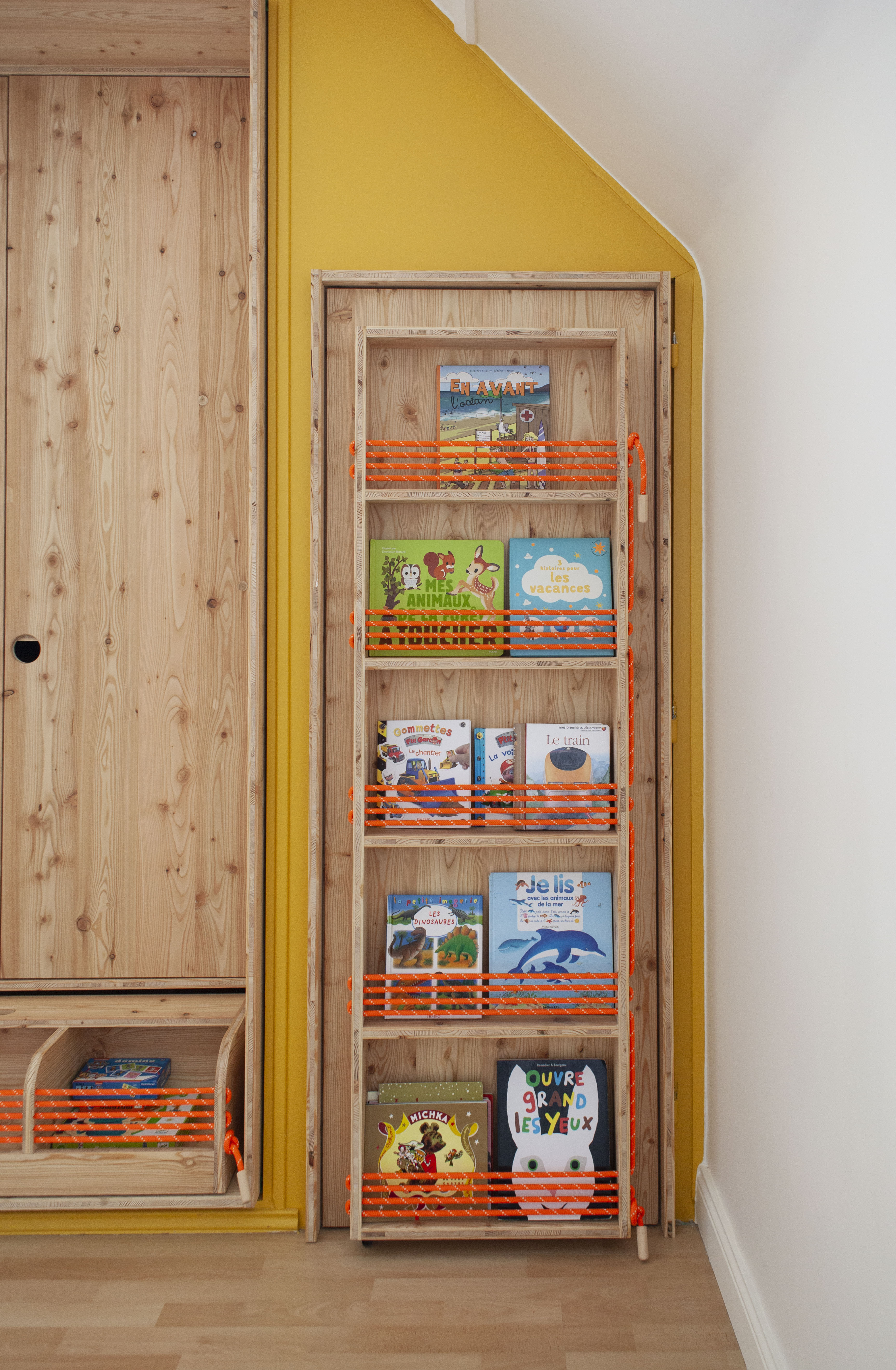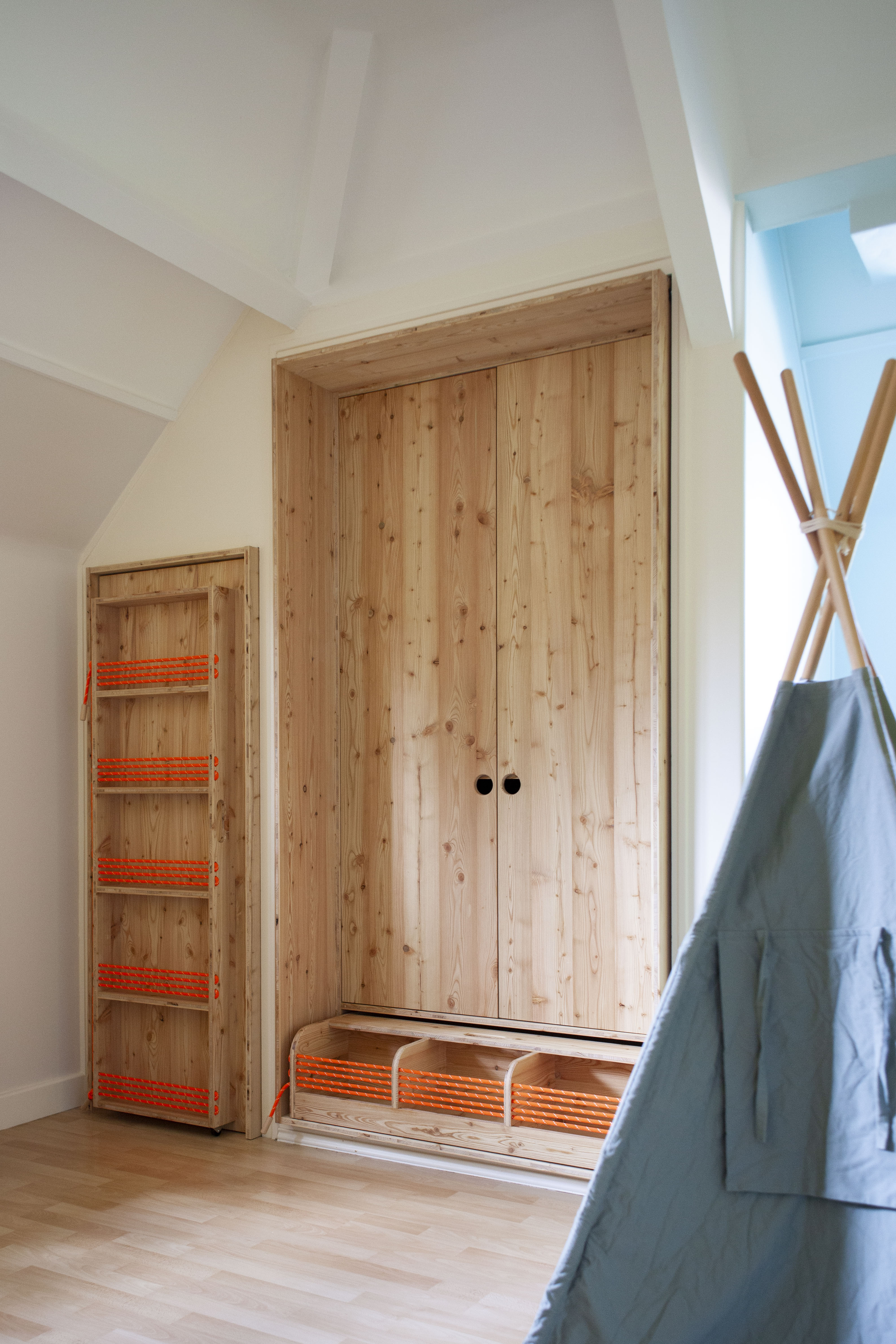 Création de deux dressings et placards habillés d’une porte bibliothèque et d’un tiroir à jouets.