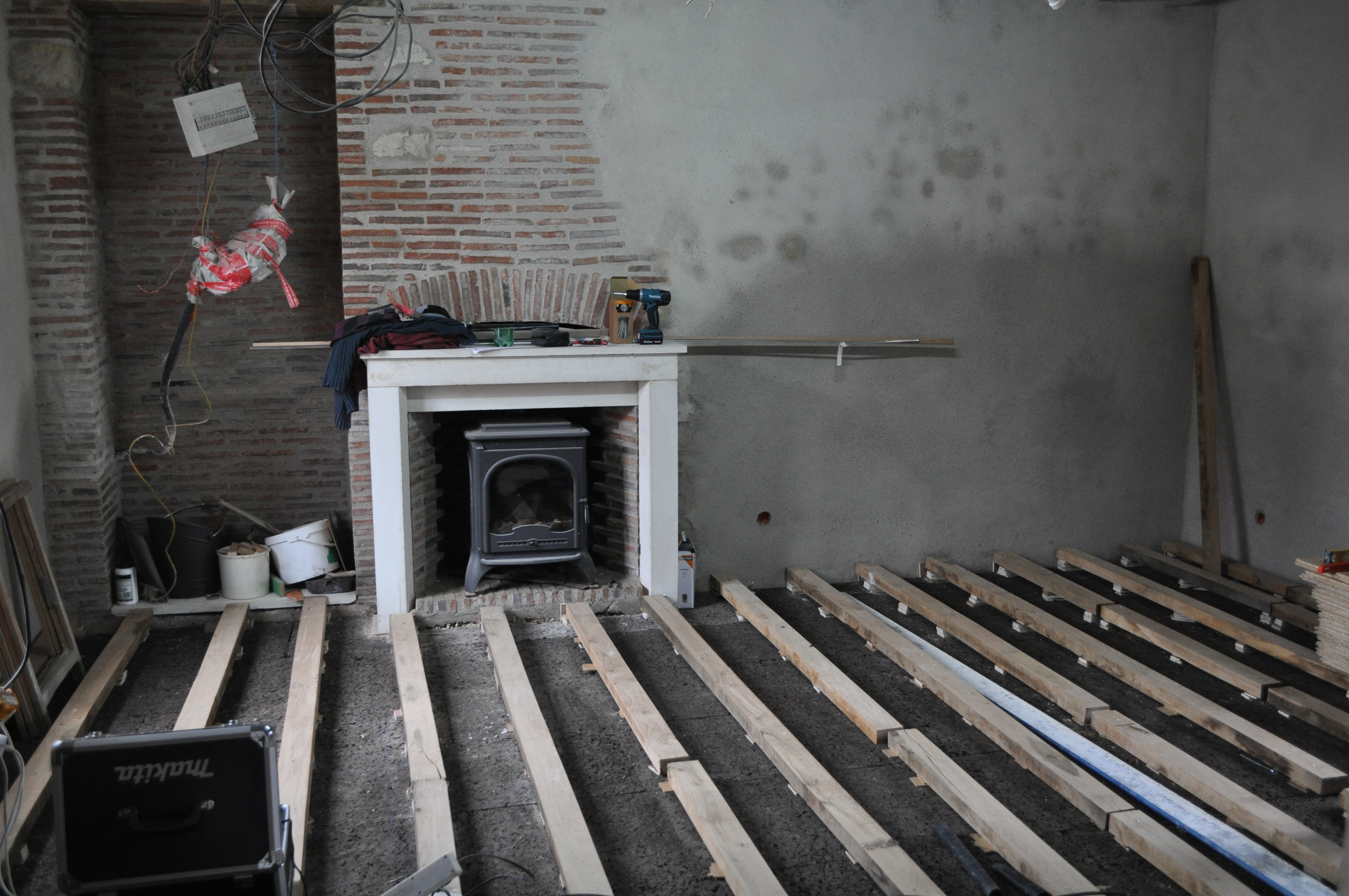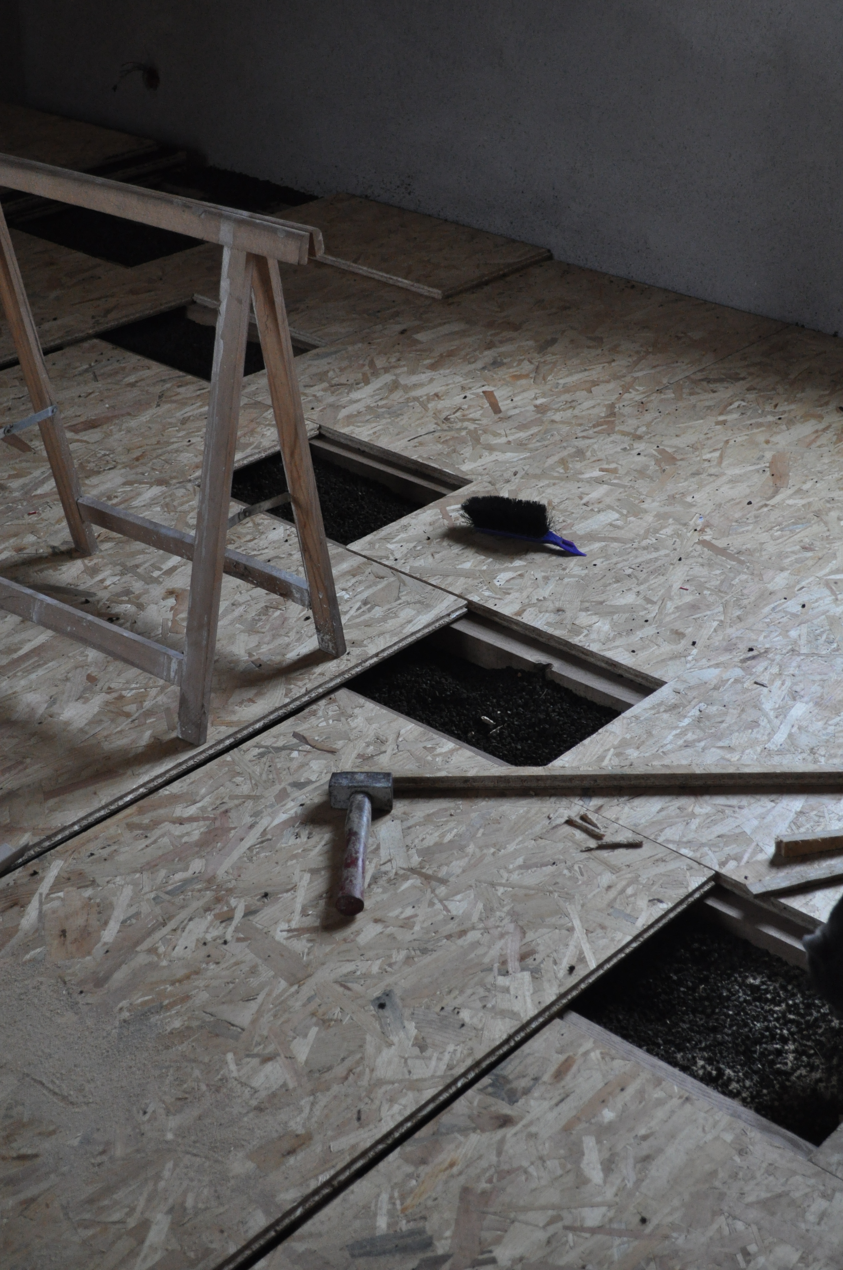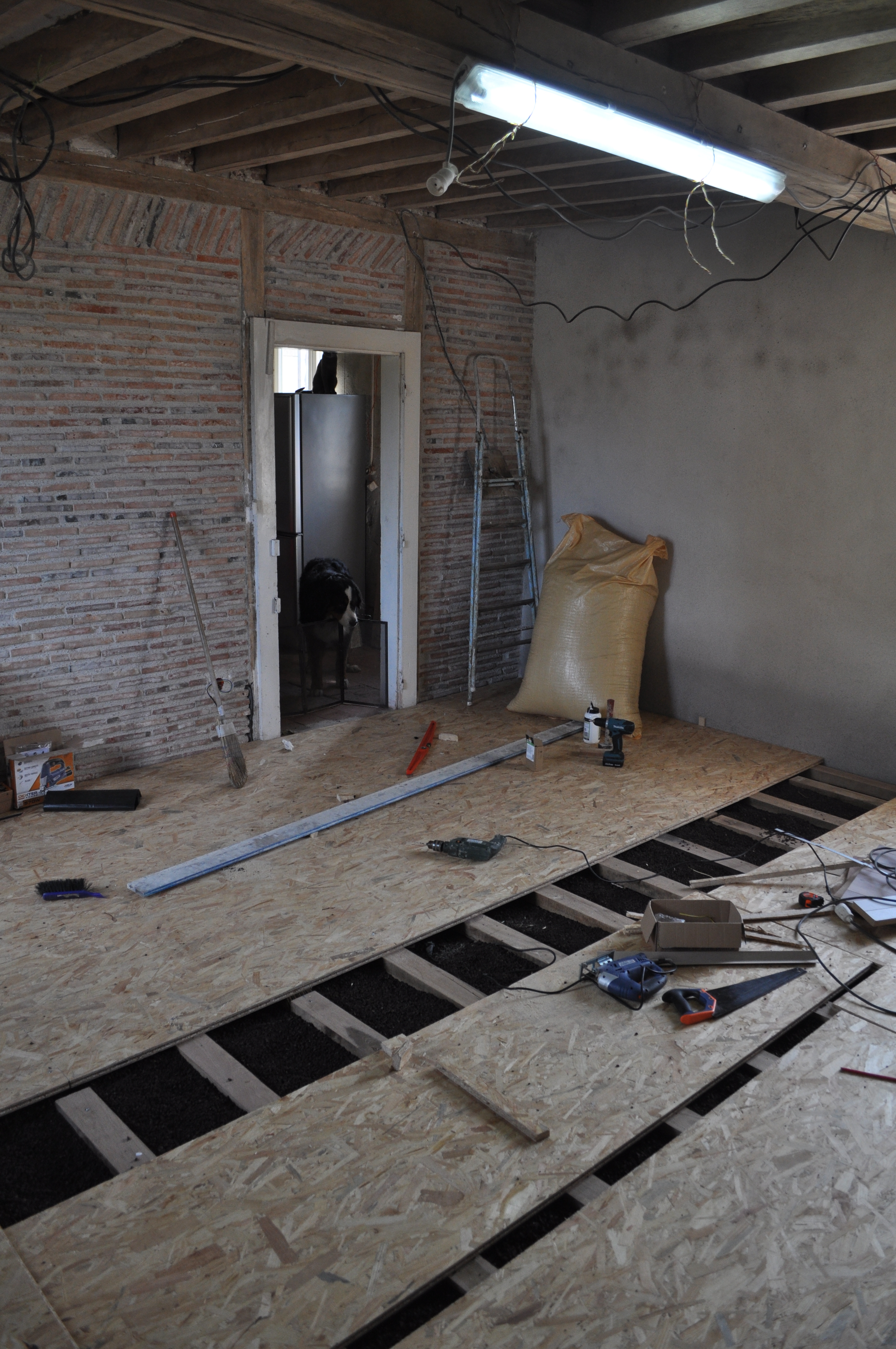 Sol en parqué massif chêne batons-rompus sur complexe structurel compatible ; hérisson de gravier, dalle de chaux, isolation liège rigide, lambourdes chêne, dallage osb aéré, parquet collé,